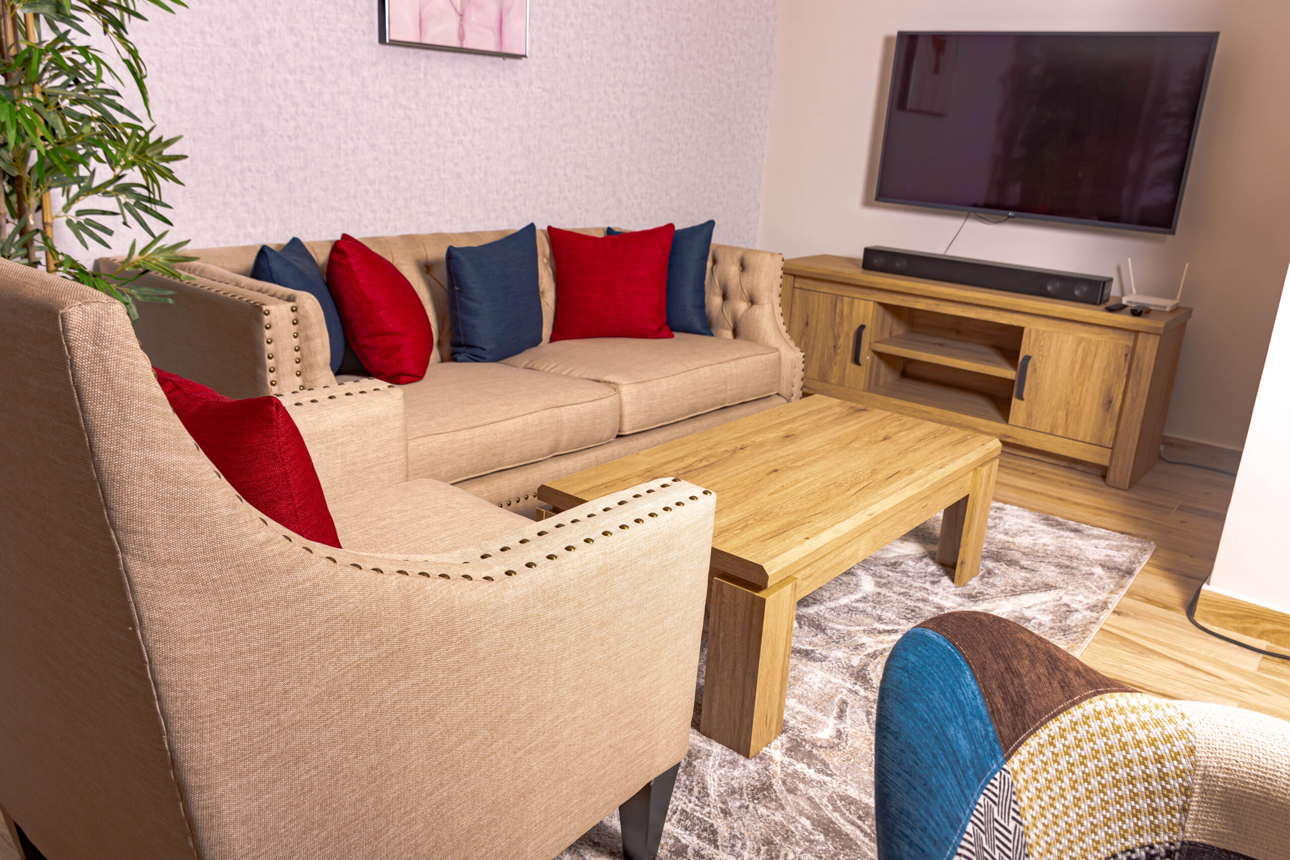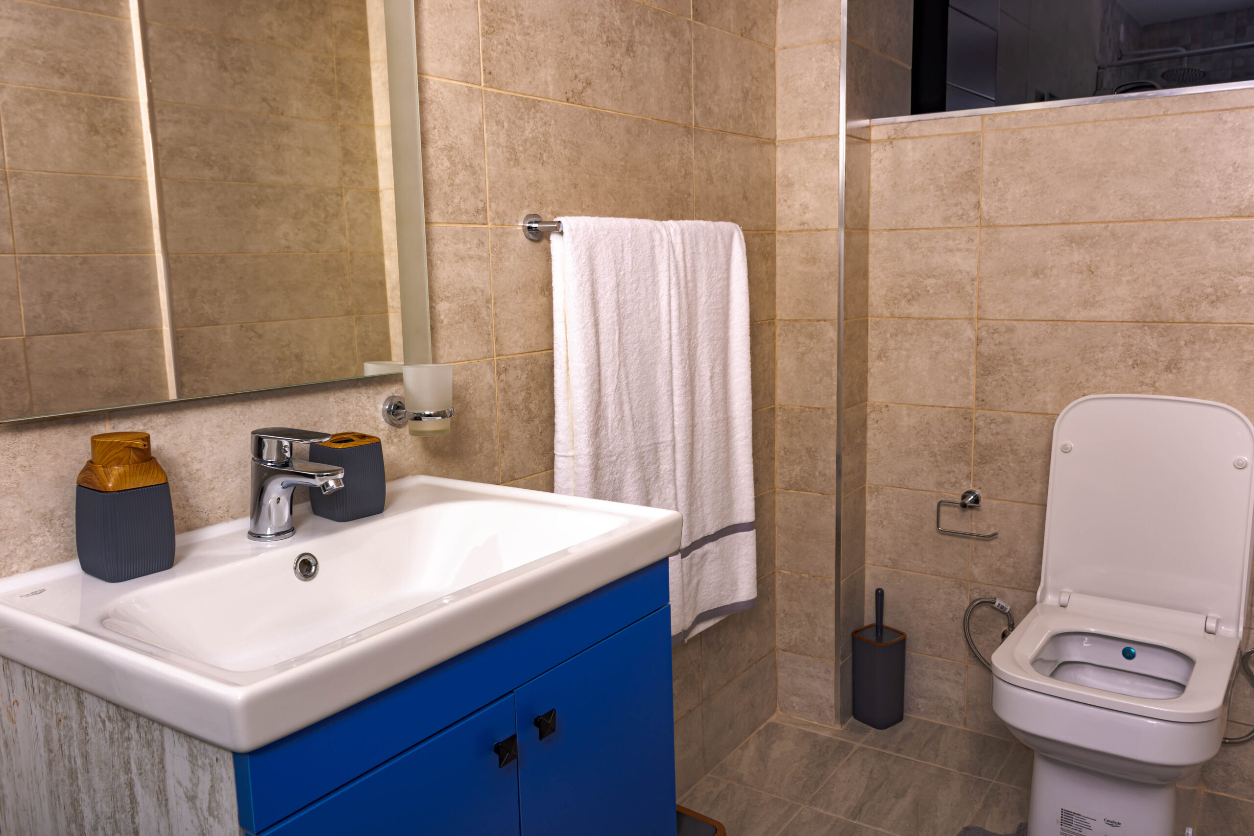 The bathroom in the apartment is well-appointed, with modern fixtures, tiles, and is easily accessible from the common areas. The entire apartment is elegantly decorated with a mix of modern and cozy furnishings. The walls are adorned with art and decorations that add personality and warmth to the space. Throughout the apartment, the lighting is adjustable to create the desired mood, whether you’re looking for a cozy atmosphere in the evening or a well-lit space during the day.