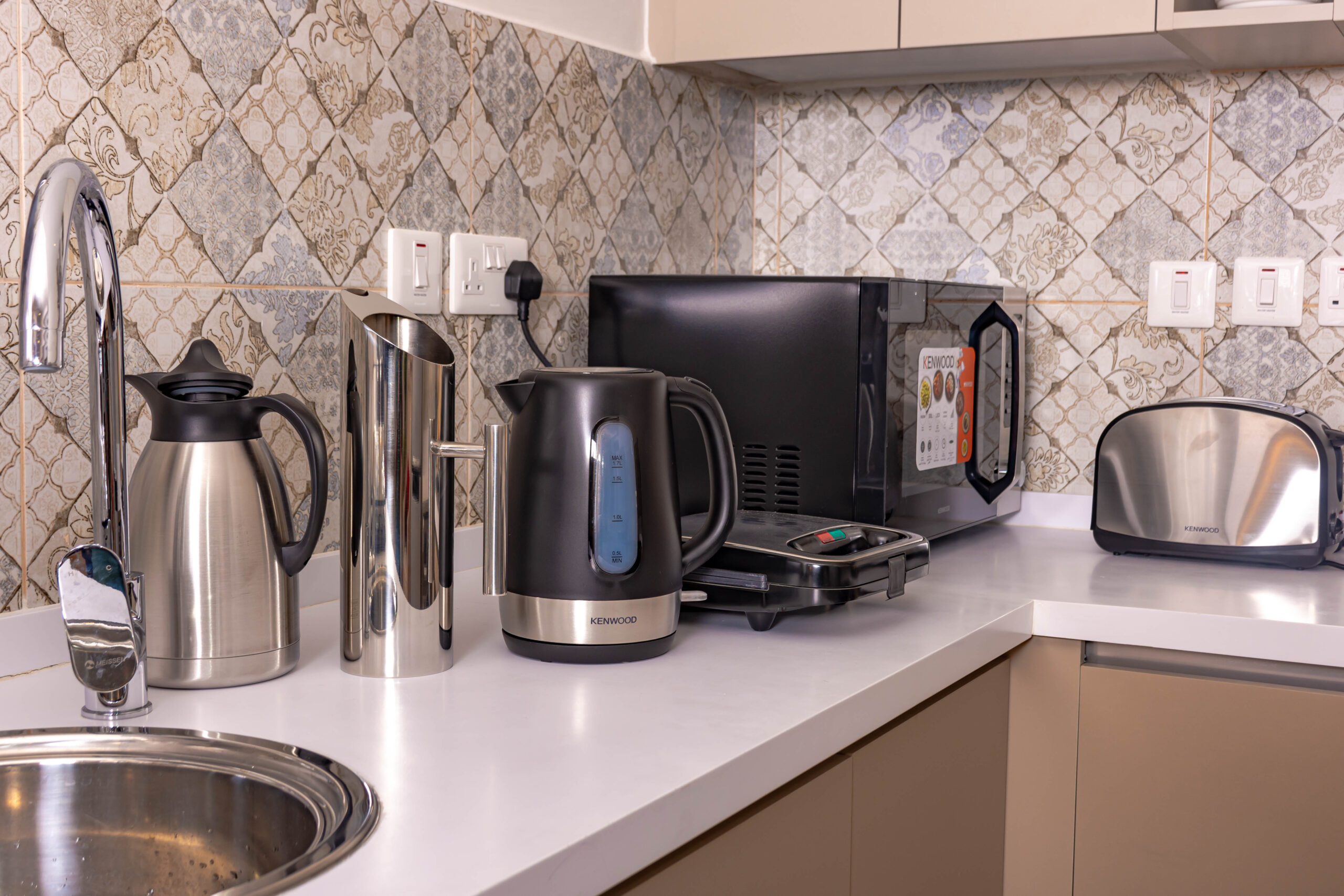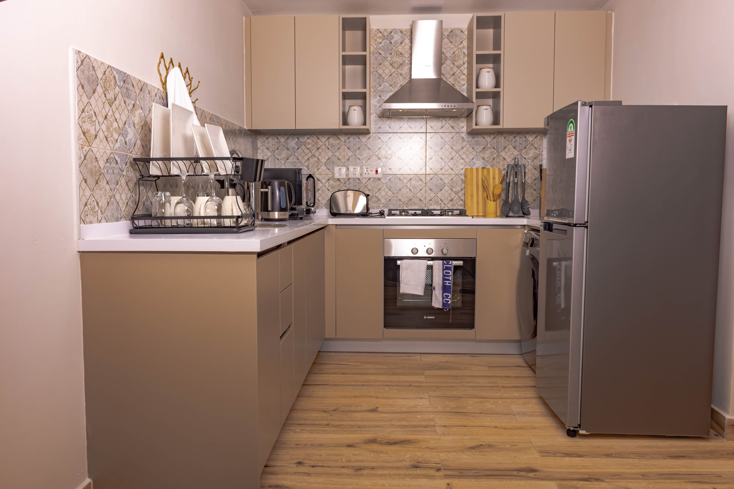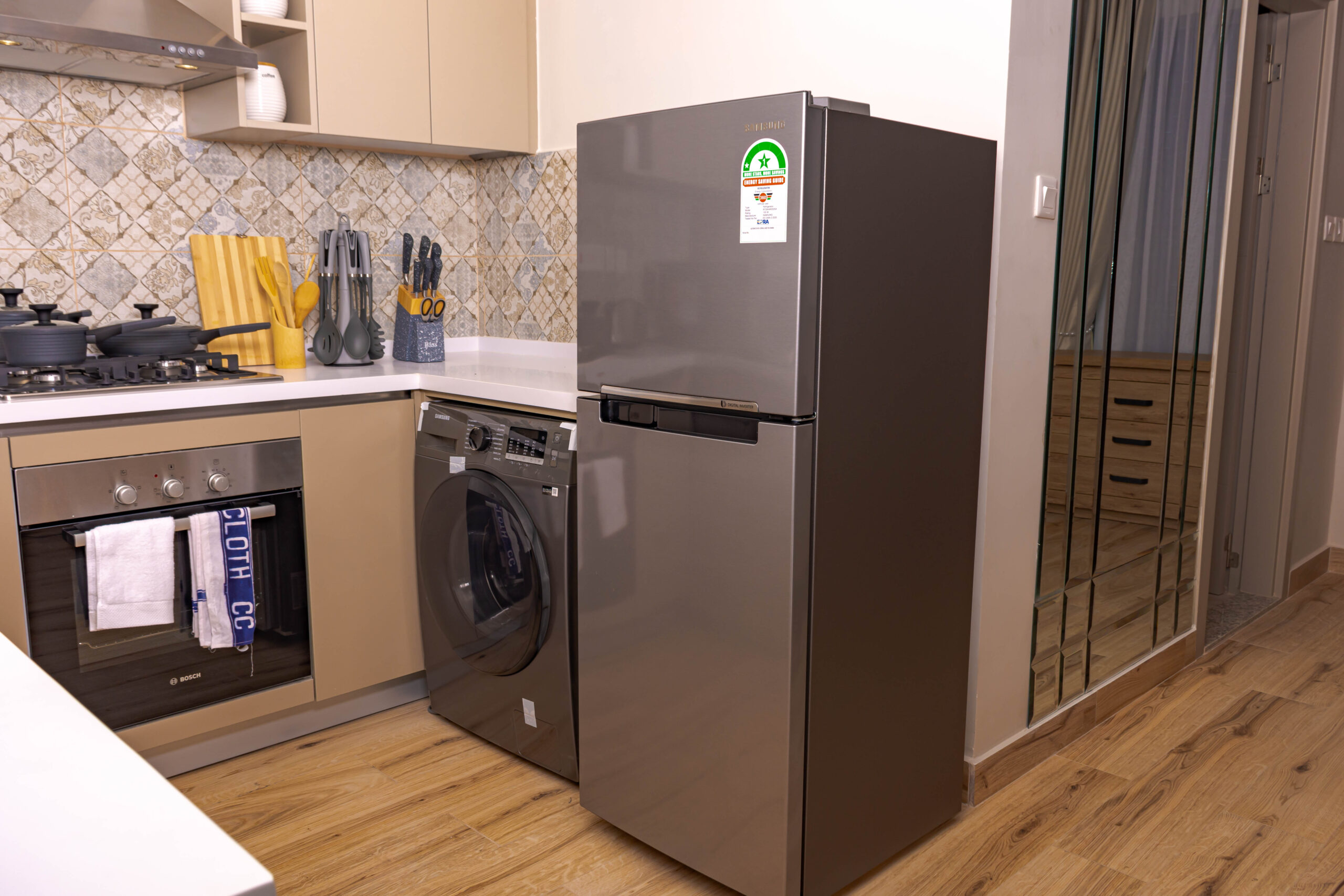 An open-concept kitchen with a breakfast bar or island adjoins the living area. It’s equipped with modern, high-end appliances and elegant granite countertops. The dining area, with a stylish table and comfortable seating for four, is strategically placed near the windows, allowing you to enjoy your meals while gazing at the city lights.